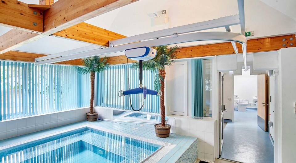 A recent project involved installing a hoists system that provided a transfer from a changing room out to a communal pool area. The changing space had a traditional flat ceiling (albeit, quite high), whilst the pool had a vaulted ceiling, with visible laminated timber beams proving the structural support.