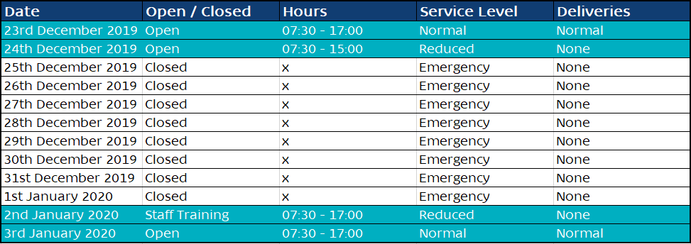 Our telephones will be answered out of hours and any urgent message will be passed to the Support Team. However, please be aware that our capabilities over this period will be limited and response times may be extended.