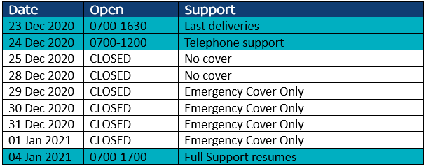 Our telephones will be answered out of hours and any urgent message will be passed to the Support Team. However, please be aware that our capabilities over this period will be limited and response times may be extended.