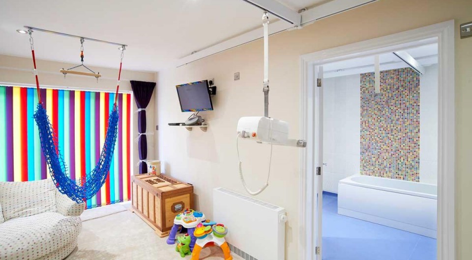 This conversion required the redevelopment of the existing space to provide a bedroom and therapy/play space adjoined by a bathroom with a flush floor shower area. The client required minimal handling and had asked for a hoist system that connected both rooms.