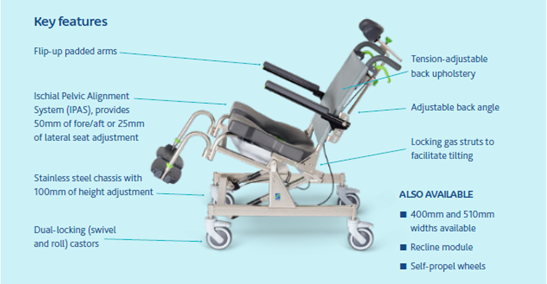 - The seat-to-floor height adjustability allows the chair to easily clear different toilet heights and gives carers easier, more manageable access to the user.
