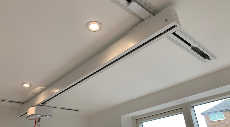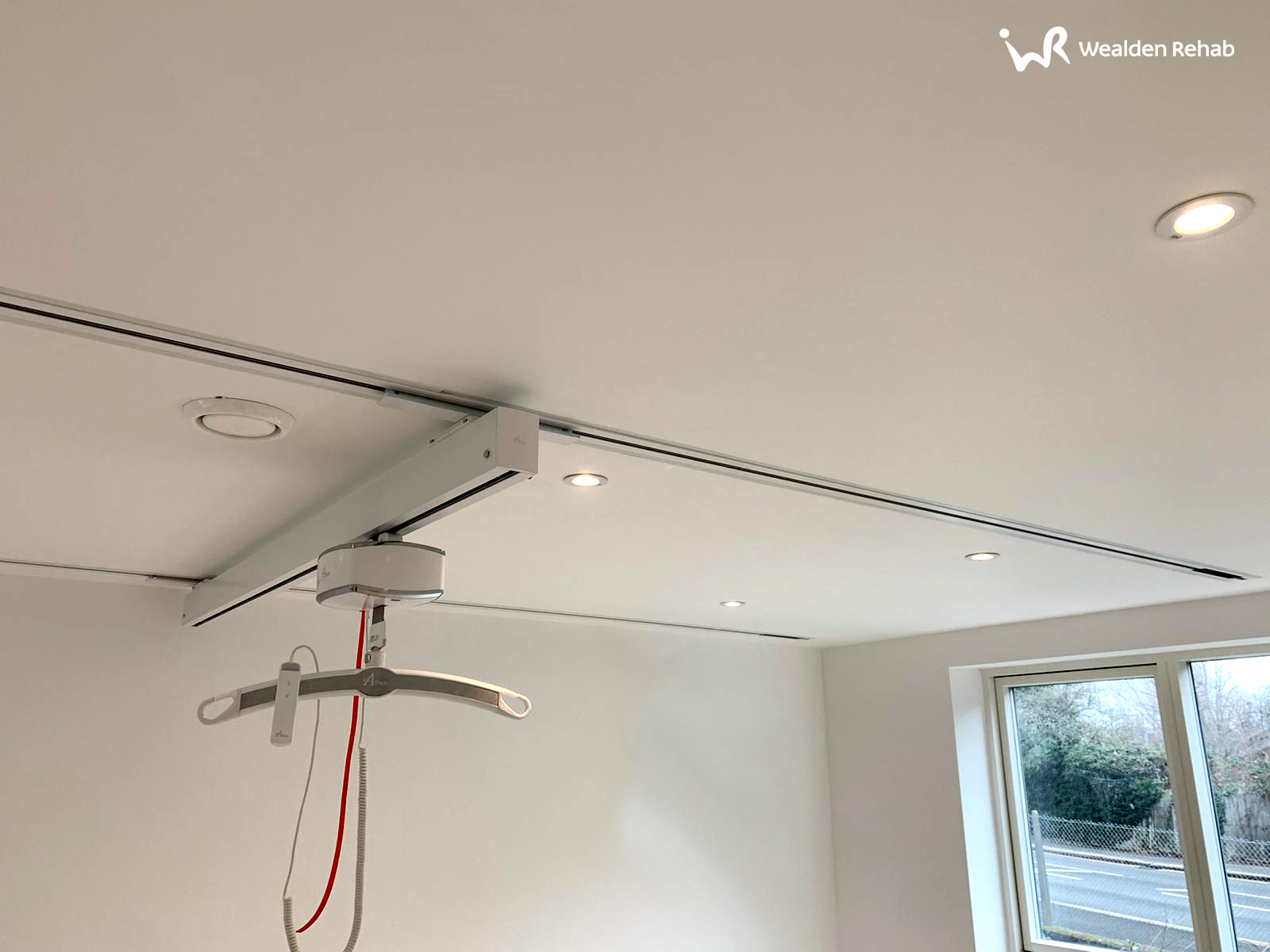 We suggested that we could hide the fixed rails of her hoists within the ceiling line and this was agreed to. Working with the builder we visited before the ceiling boards were put up to install the support structure within the floor space and install the fixed rails in such a way that the ceiling boards would be flush with the lower edge of the rail. The rails were protected against construction damage and then, once the ceilings had been decorated we returned the site to install the travelling rails and hoist units.