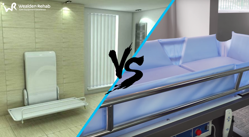 The wall mounted bed can only be accessed from one side, as the other is against the wall, whereas the mobile trolley has the benefit of being able to be moved into a position where care assistants can stand either side of the user which results in more dignified care. A shower trolley also benefits from end guards too.