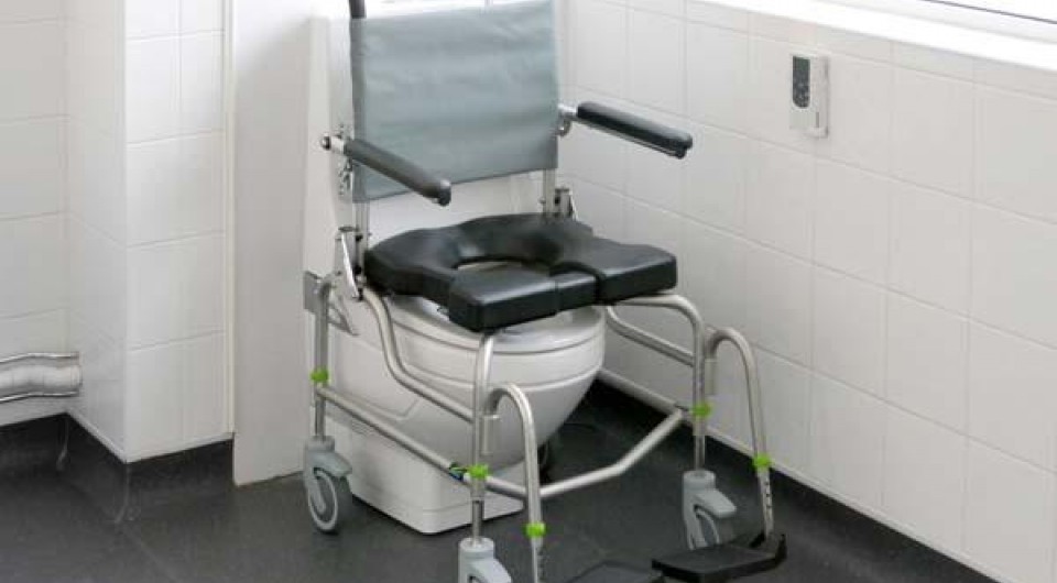 The chair should be adjusted to the correct height to allow the chair to move back over the WC without fouling on the toilet seat. The rear frame bar ensures that the WC extract fan and water heater are activated and allows the WC to be operated from the infrared or wireless hand control.