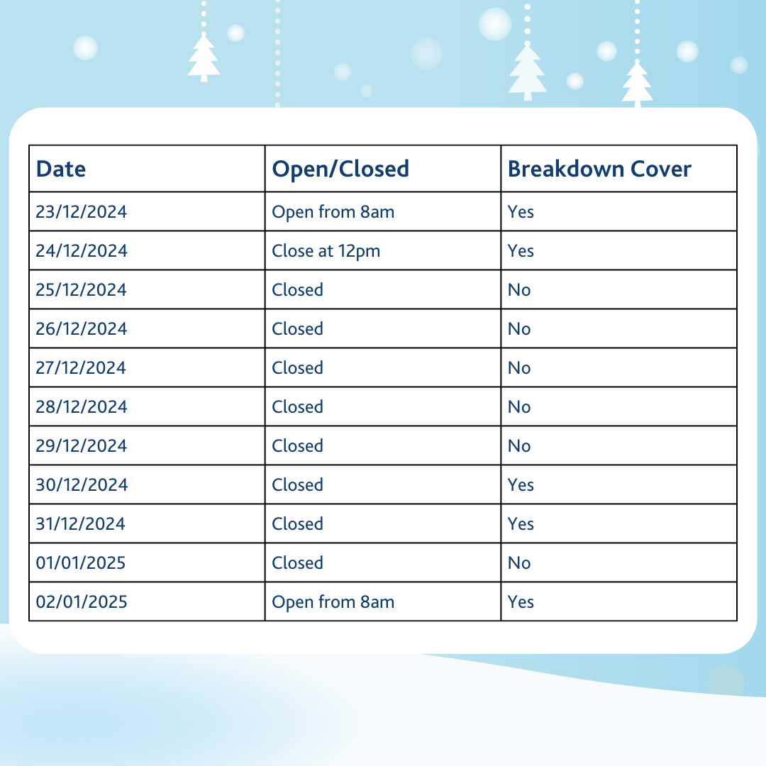 Our telephones will be answered out of hours and any urgent message will be passed to the Support Team. However, please be aware we will be limited in our capabilities and may take longer to respond during this period. Please contact the team prior to Tuesday 24th December should you require any additional equipment to reduce the risk in the event of a breakdown. Our online resources are always available and may be able to answer any product queries.