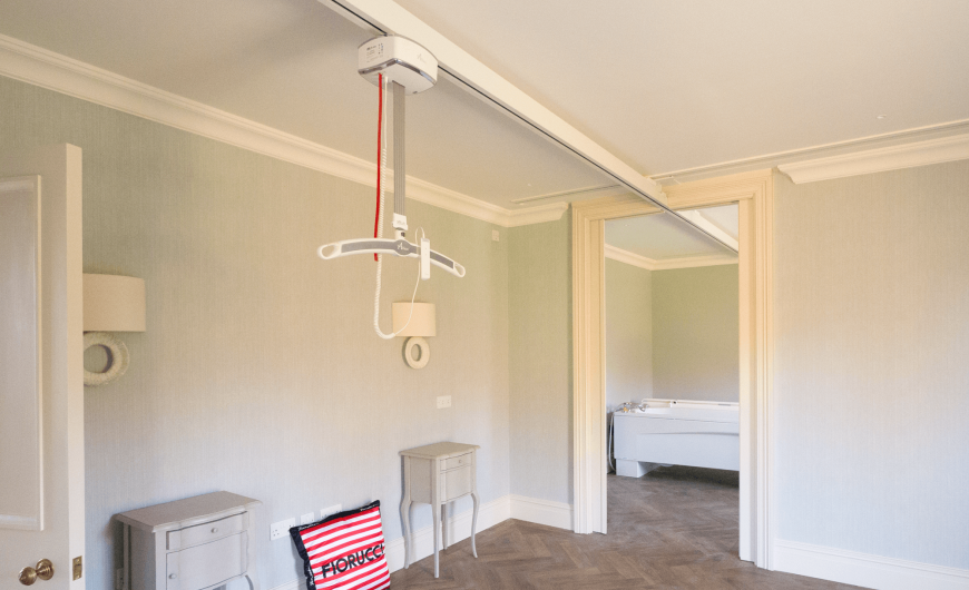 To enable the transfers in each room, both rooms were installed with an XY track system, with the fixed tracks integrated (inset rails) into the ceiling to minimise visual intrusion. The moving tracks in each room were connected by a transfer gate system allowing the GoLift hoist unit to move between the rooms. The doorway between the rooms was generously proportioned at 1200mm wide and equipped with an Eclisse double pocket door. The header track and doors were customised to close around the hoist track, closing the aperture completely.