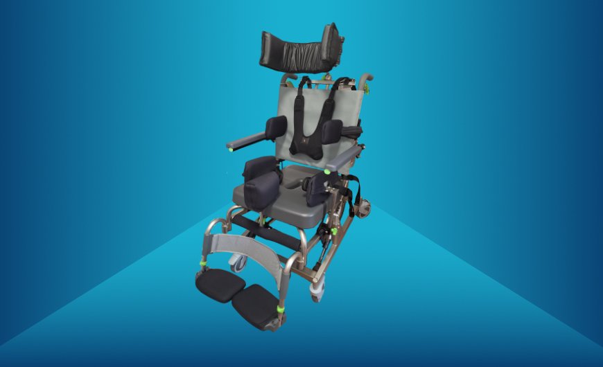 - Lateral supports, pommel, chest harness, lap belt, and headrest for total body support.