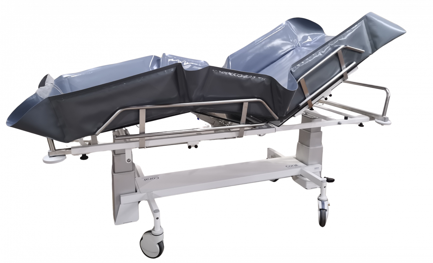 Innovative profiling shower trolley giving a new level of support and flexibility to those needing care.